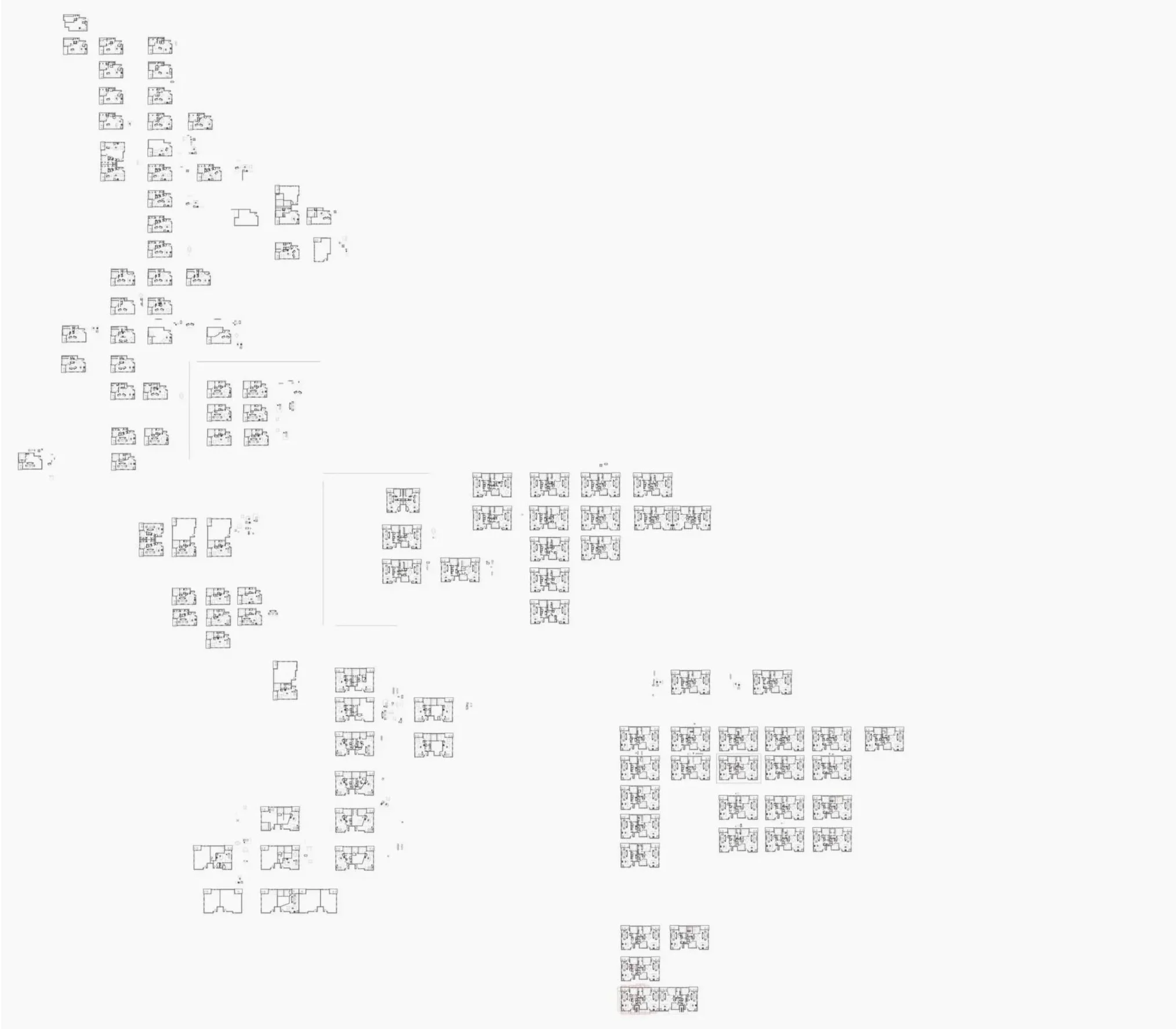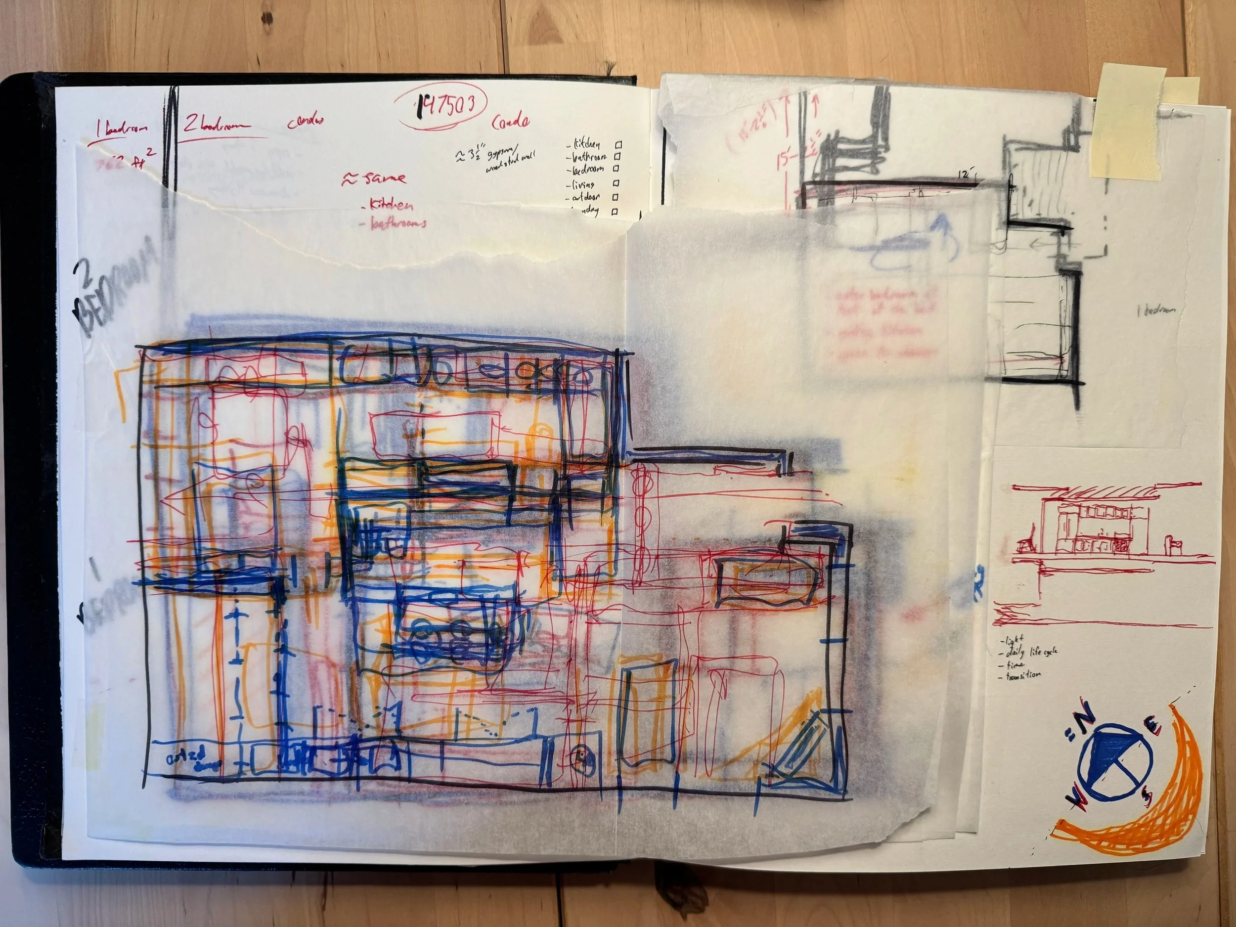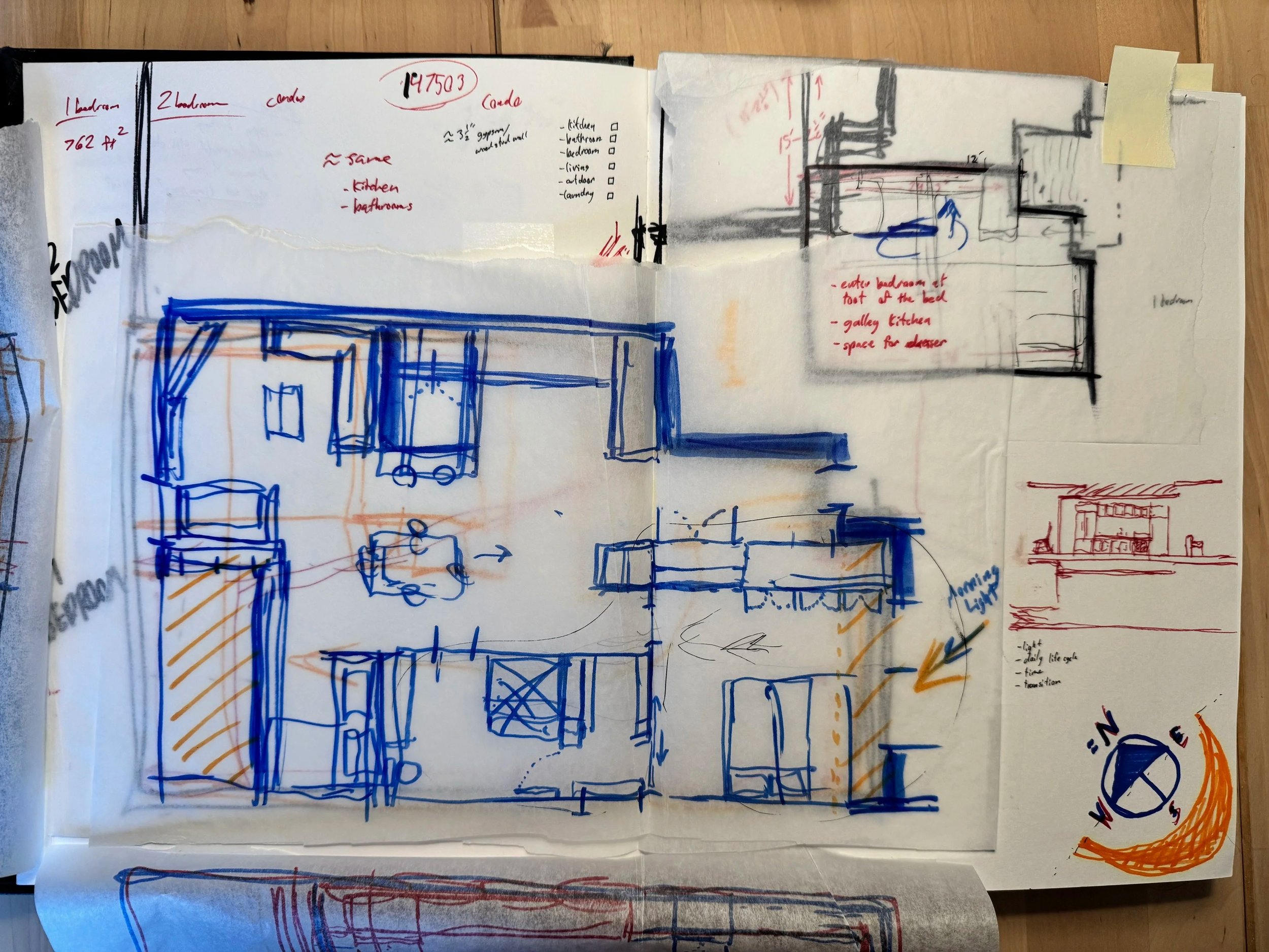Focus on this project went to the development of unit plans that would fill 2 variations of a predetermined shell used for 4 of the 5 apartment buildings. A 1-bedroom unit and a 2-bedroom unit would be grouped together and repeated up 4 floors to make up the 2 smallest buildings, while the larger 2 buildings would mirror this configuration, doubling the number of apartments within.